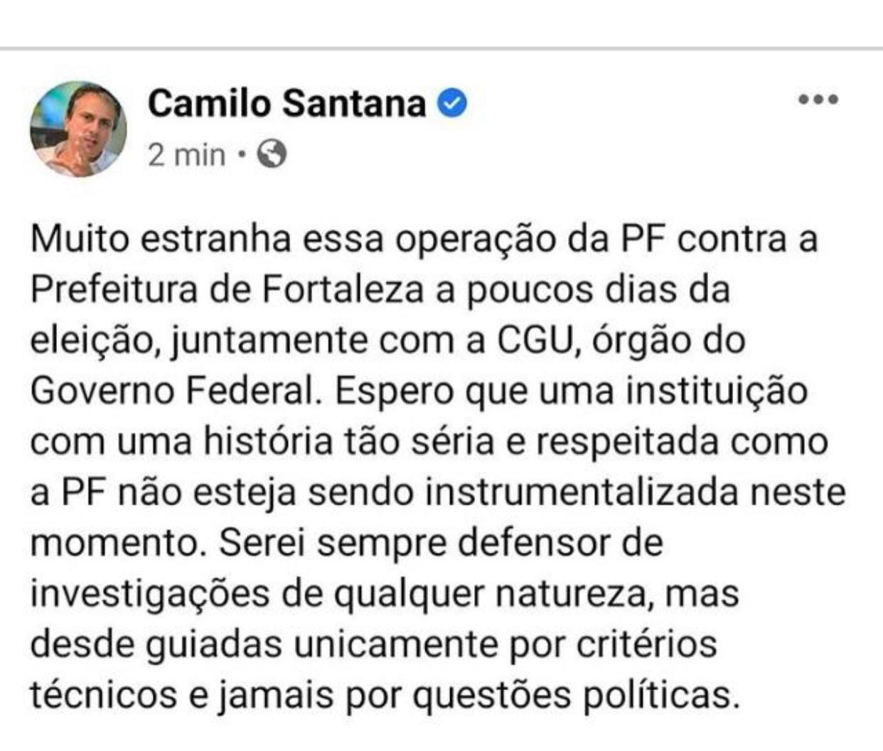 O governador do Ceará, Camilo Santana, condenou, por meio de suas redes sociais, a operação Cartão Vermelho da Polícia Federal (PF), que identificou corrupção na prefeitura de Fortaleza. A operação, segundo o delegado Alan Robson, investiga irregularidades no uso de verbas direcionadas para o combate ao novo coronavírus.