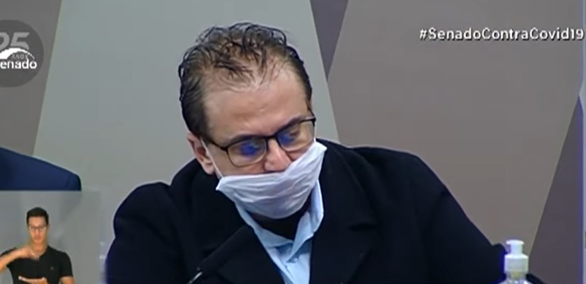 Máscara colocada pelo depoente após o pedido de Randolfe. Foto: Reprodução/TV Senado