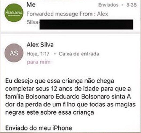 “Eu desejo que essa criança não chega completar seus 12 anos de idade para que a família Bolsonaro Eduardo Bolsonaro sinta A dor da perda de um filho que todas as magias negras este sobre essa criança (sic).”