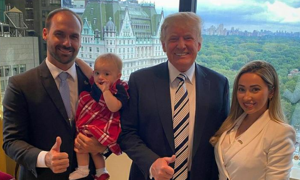 O deputado federal Eduardo Bolsonaro (PSL-SP) esteve em um encontro com o ex-presidente dos Estados Unidos, Donald Trump. O filho do presidente Jair Bolsonaro (sem partido), compartilhou fotos do encontro com o republicano em suas redes sociais. Na legenda, Eduardo expressou sua felicidade com o encontro. “Estou do lado dos que não se curvam ao politicamente correto, que lutam contra regimes autoritários, evitando assim novas guerras”, disse.