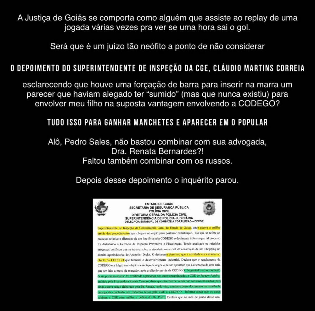 “Será que é um juízo tão neófito a ponto de não considerar *o depoimento do Superintendente de Inspeção da CGE, Cláudio Martins Correia, esclarecendo que houve uma forçação de barra para inserir na marra um processo que haviam alegado ter “sumido” (mas que nunca existiu) para envolver meu filho na suposta vantagem envolvendo a CODEGO”, escreveu o empresário.