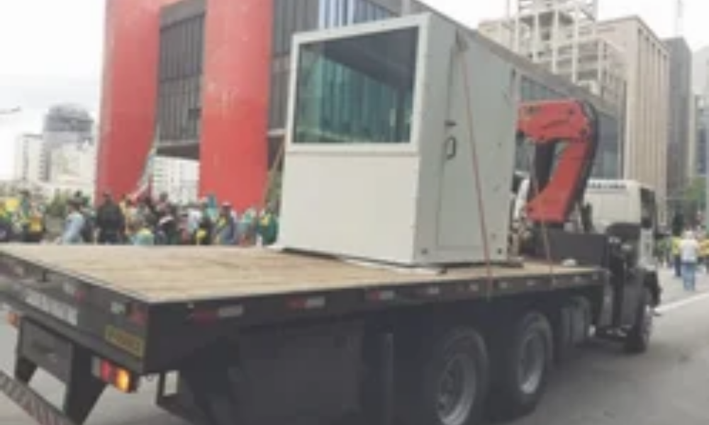 A cabine, destinada especificadamente a manifestação em São Paulo, está sendo montada em frente ao Museu de Arte de São Paulo (Masp).