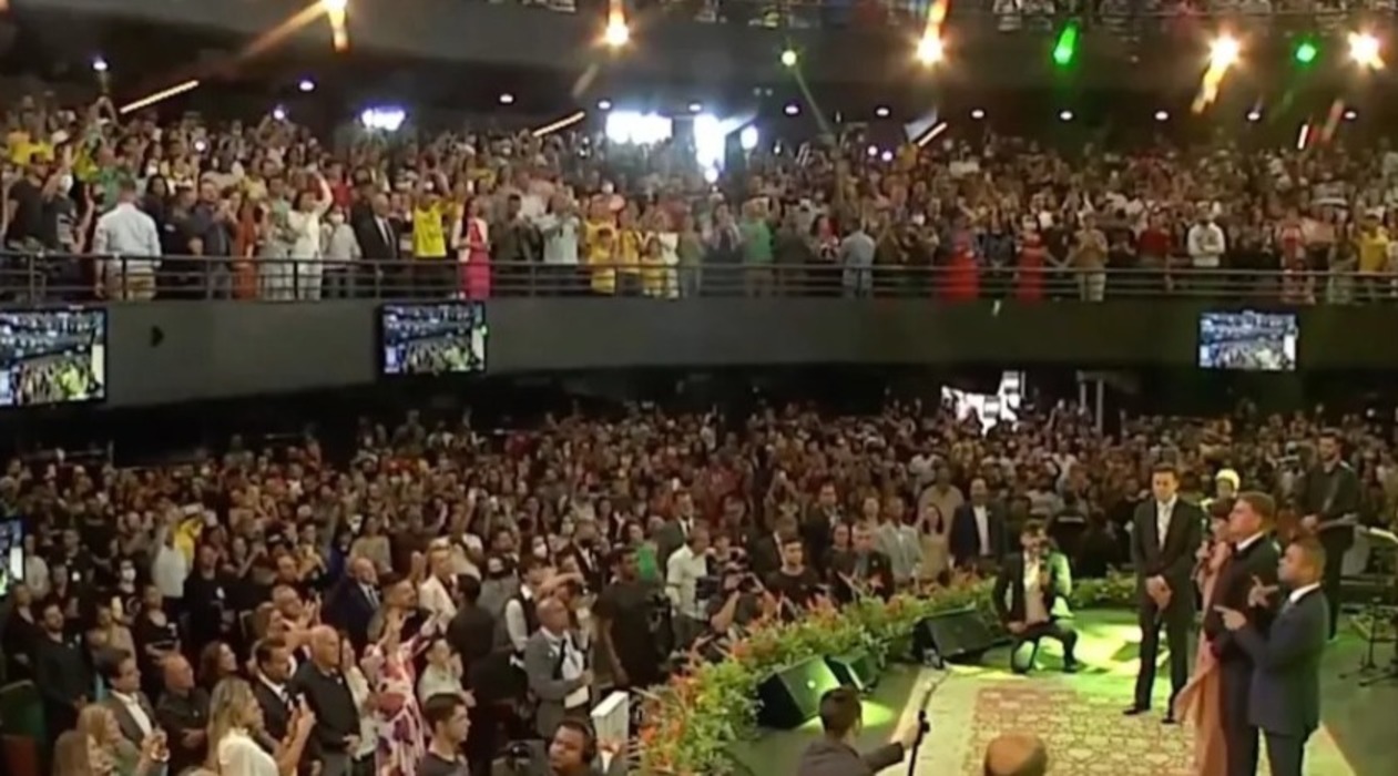 Os evangélicos, em sua maioria, apoiam Bolsonaro, mas o presidente tem índices baixos de popularidade entre as mulheres. No começo do mês, Michelle fez um culto no Palácio do Planalto, à noite. Em vídeos que circularam nas redes sociais, ela apareceu com uma bíblia na mão enquanto descia a rampa do Planalto com um grupo de religiosos. Hoje, no ato de campanha, rezou o “Pai Nosso”, oração cristã.