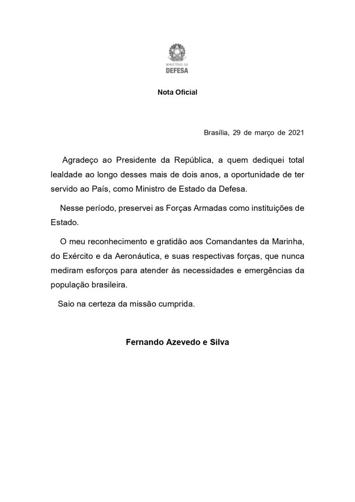 O ministro da defesa Fernando Azevedo e Silva pediu demissão do cargo de ministro nesta segunda-feira (29). “Agradeço ao Presidente da República, a quem dediquei total lealdade ao longo desses mais de dois anos, a oportunidade de ter servido ao país como Ministro de Estado e da Defesa”, diz a nota oficial.