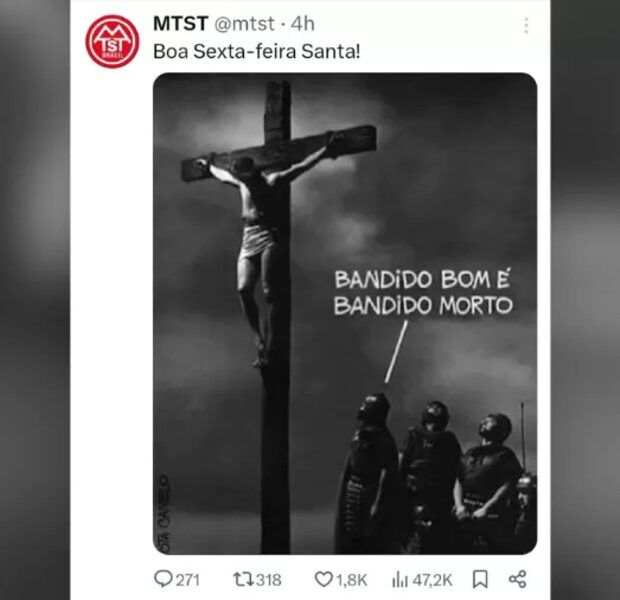 Na imagem, era possível ver a ilustração de Jesus Cristo crucificado e dois personagens gritando “Bandido bom é bandido morto”. “Boa Sexta-feira Santa!”, escreveu o MTST na legenda. O post teve mais de 1,5 milhão de visualizações.