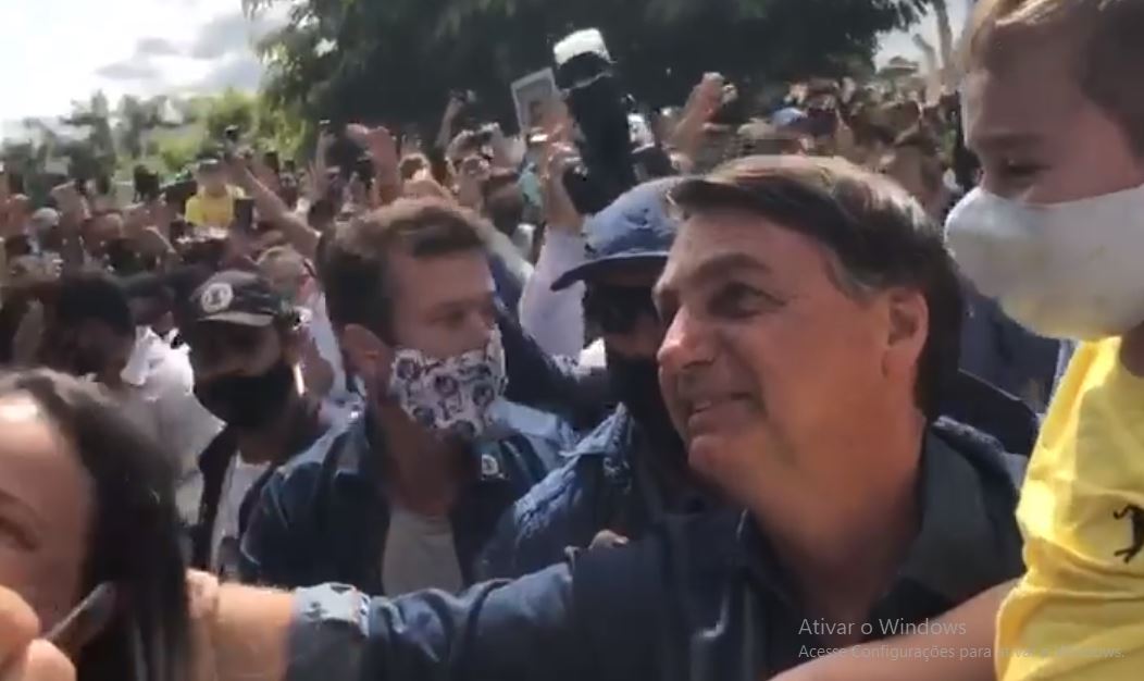 Ao deixar a aeronave, Bolsonaro se dirigiu aos populares e, mais um vez, ignorou as recomendações sanitárias para contenção da covid-19. Não usou máscara e ainda cumprimentou a população com acenos, toques de mãos e pose para fotos.