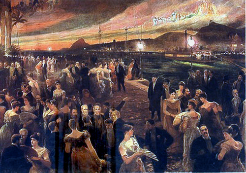 O assanhamento dos bacanas para irem ao tal baile começou no quatro de novembro, quando soube-se que cinco mil convites haviam sido impressos. Perto de rolar a festa, a família imperial pintou para o embarque, aproximando-se das 10 da noite, com Dom Pedro II “fantasiado de Almirante”, sem nunca ter entrado em um navio. Chegados ao prédio do baile, na Ilha Fiscal, foram levados para um salão onde os esperavam integrantes do corpo diplomático estrangeiro, oficiais e os bacanas da sociedade carioca. A imperatriz Teresa Cristina usava vestido de renda de chantilly preta, guarnecido por vidrilhos. Por toalete, roupa de moiré preta listrada, tendo na frente um corpinho alto bordado a ouro. Nos cabelos, diadema de brilhantes.