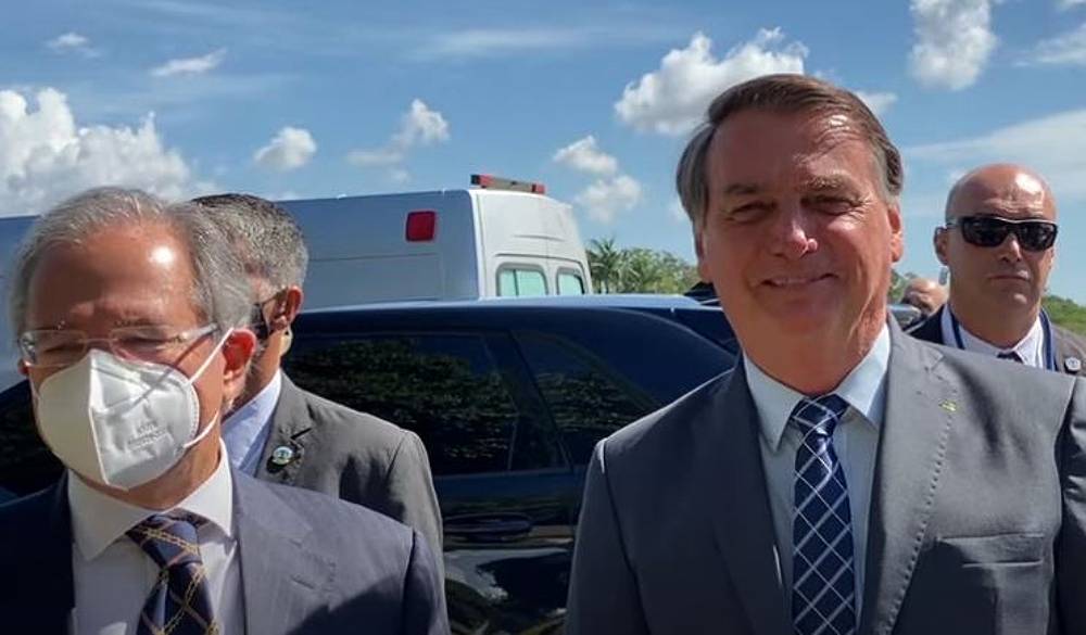 Com máscara e ao lado do presente, Guedes fez uma análise rápida sobre o PIB brasileiro, que caiu 4,1%. “Os países mais avançados tiveram quedas de PIB bem maior que o Brasil. A Inglaterra caiu mais de 9%, a Itália caiu mais de 8%. Além de termos caído menos que vários países mais avançados, nós conseguimos criar empregos formais.”