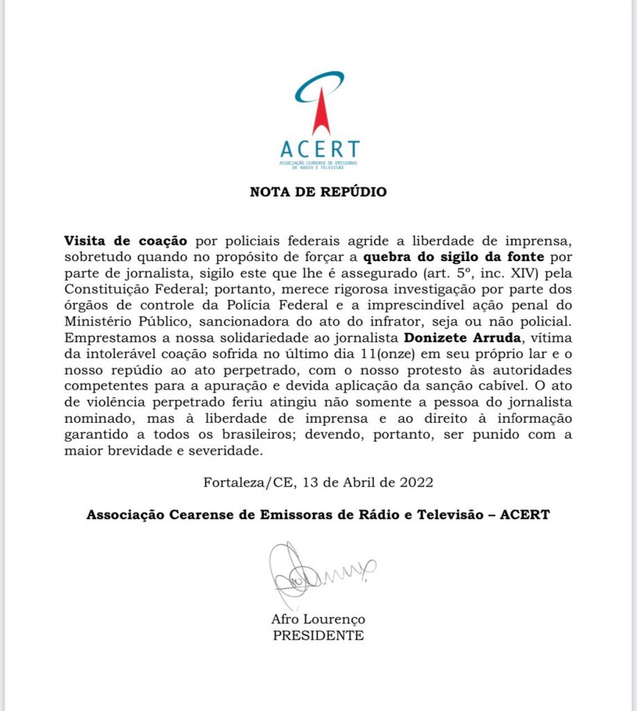 A Associação Cearense de Emissoras de Rádio e Televisão (ACERT), em nota, classificou a ação policial como uma agressão a “liberdade de imprensa”, ainda mais com o propósito de forçar a quebra de sigilo da fonte, que é garantido pelo art. 5º, inc. XIV, da Constituição Federal.