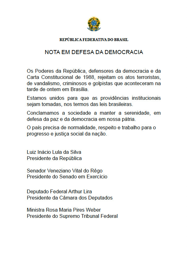Os presidentes dos Poderes da República se juntaram para assinar, na manhã de hoje (9), uma nota em defesa da Democracia, em repúdio aos atos golpistas que aconteceram ontem em Brasília.