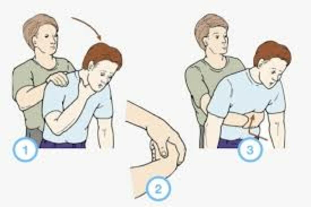 Agora, devem ser realizados antes ciclos repetidos de cinco golpes nas costas, entre as escápulas, seguidos de cinco compressões abdominais até que o objeto seja expelido, com a cabeça da vítima inclinada para baixo.