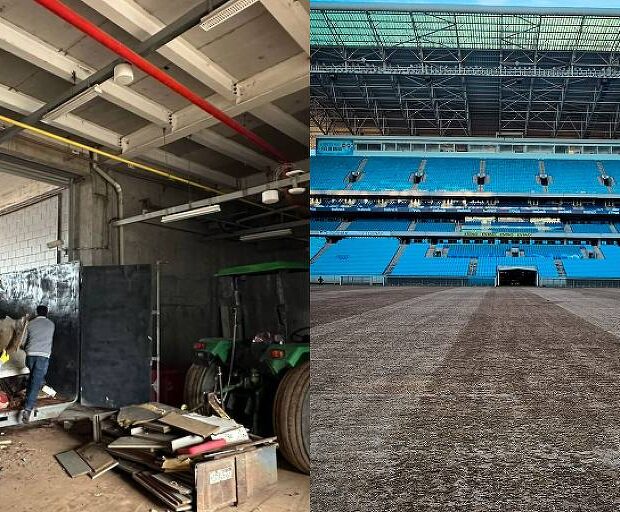 A Arena do Grêmio e o Beira-Rio passam por processos de limpeza e recuperação após os estragos causados pela enchente de proporções históricas em Porto Alegre. A inundação danificou os gramados, além de outras estruturas, nos estádios da dupla Gre-Nal.