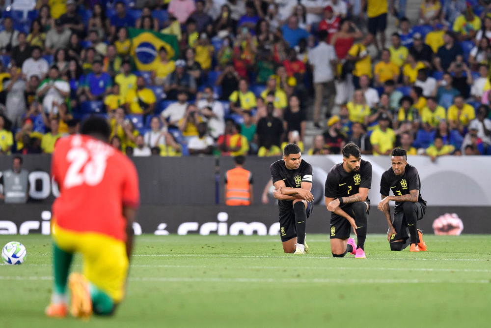 “Com racismo não tem jogo”. Sob o lema antirracista, que moldou o cenário do amistoso deste sábado, a seleção brasileira venceu Guiné por 4 a 1, no vazio Estádio Cornellà-El Prat, em Barcelona, na Espanha. Durante o primeiro tempo, o Brasil atuou com um uniforme preto pela primeira vez em sua história. O jogo ainda ficou marcado por manifestação dos jogadores, cartazes da torcida em homenagem a Vinícius Júnior, que marcou um dos gols, e um caso de racismo contra um amigo do atacante do Real Madrid nas dependências do estádio antes de a bola rolar.