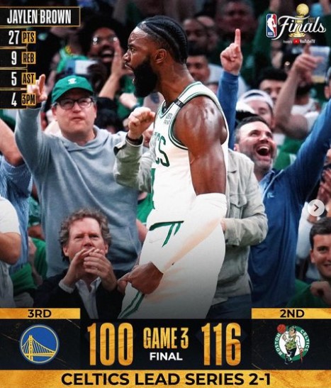 O Boston Celtics venceu, nesta quarta-feira, o jogo 3 da final da NBA, por 116 a 100. Jogando diante de seus torcedores, no TD Garden, a franquia de Massachusetts retomou a vantagem e fez 2 a 1 na série com o Golden State Warriors. Os finalistas voltam a se enfrentar na sexta-feira, às 22h, novamente em Boston.