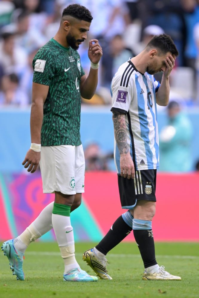 A Argentina poderia ter ido para o intervalo com uma ampla vitória. Em cinco minutos, fez outros dois gols que foram anulados por impedimento. No primeiro, Messi marcou após lançamento de Papu Gómez. Depois, Papu achou um espaço para deixar Lautaro Martínez cara a cara com o goleiro árabe, mas novamente estava em posição irregular.