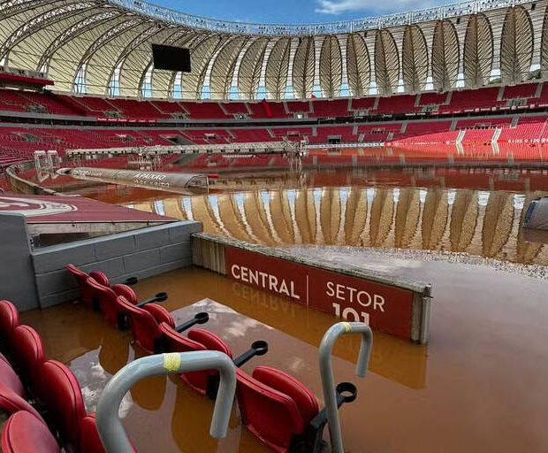 Em outras áreas, a água chegou a 1,2 metro de altura, alcançando o segundo degrau da arquibancada inferior. O estádio fica em uma área de aterro no bairro Praia de Belas, um dos mais afetados pela enchente em Porto Alegre.