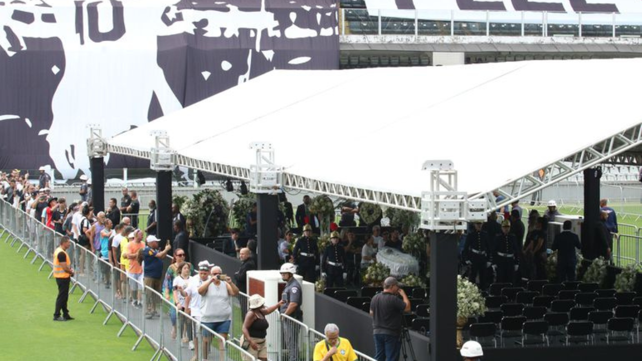 Na Vila Belmiro, ao passarem pelos portões 2 e 3, o percurso é estimado em menos de dez minutos. Fãs passam andam em fila indiana, sobre um tablado e monitorados por seguranças. Eles ficam distantes alguns metros da tenda onde está posicionado o caixão com o corpo do Rei do futebol, só acessado pela família e por convidados.