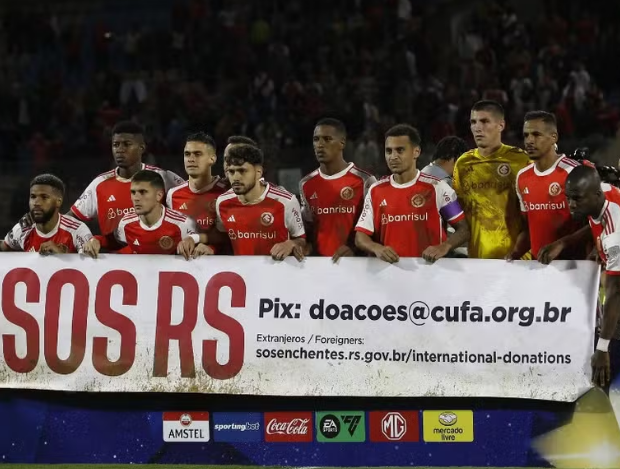 Lama no uniforme. Os jogadores do Inter entraram em campo com camisas “manchadas de lama”, uma alusão ao estrago causado pelas chuvas no Rio Grande do Sul. O traje foi assinado assinado por todos os atletas e estará disponível em um leilão virtual, com todo o lucro revertido para o estado.
