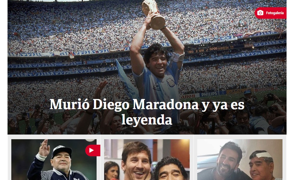 O Clarín destaca em seu site a comoção mundial pela morte do astro e diz que Maradona já é uma lenda. “E um dia aconteceu. Um impacto mundial. Uma notícia que marca uma virada na história”, diz trecho de reportagem sobre a morte do ex-jogador.