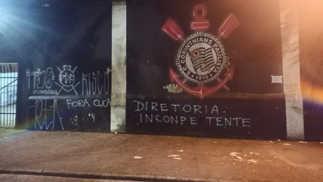Torcida Torcedores do Corinthians picham muros do Parque São Jorge em protesto contra Cuca 21/04/2023 15h39