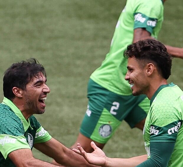 Abel Ferreira participou do “rachão” e uma das fotos mostra o treinador dando um voleio. Não é a primeira vez que o português participa e se diverte com o restante do elenco nesta atividade.