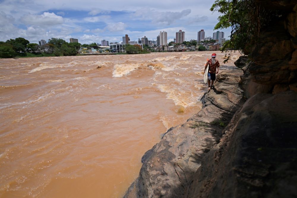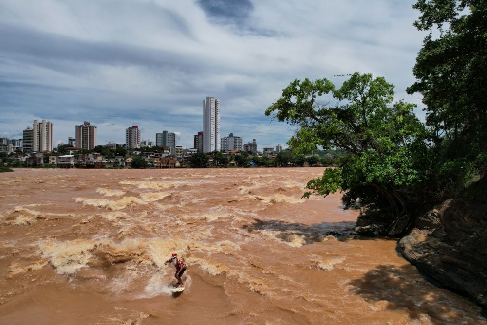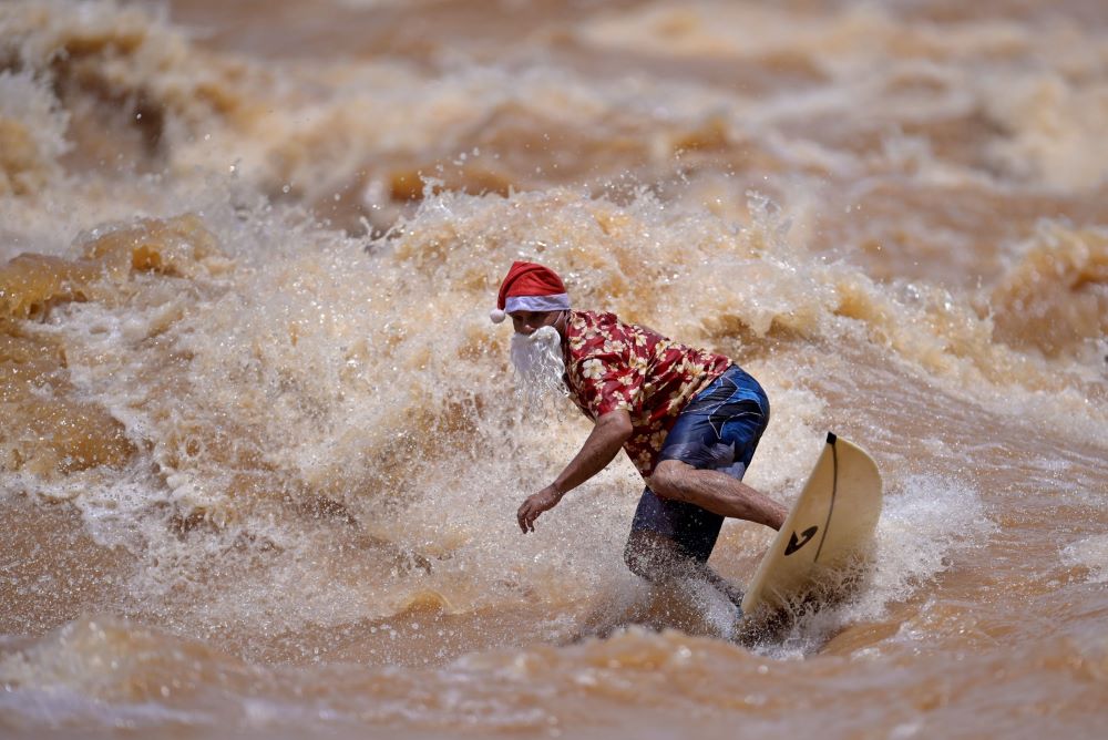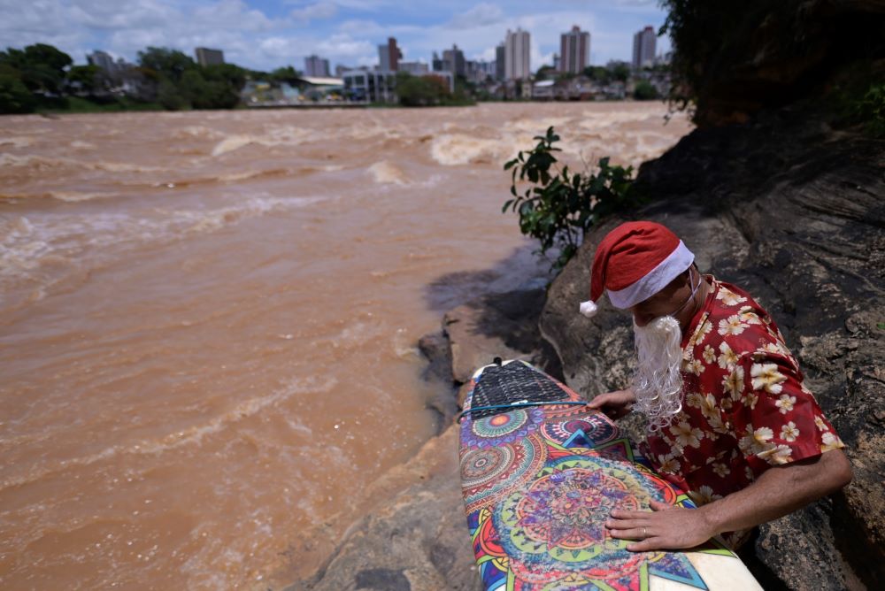 O surfista brasileiro Paulo Guido verifica sua prancha antes de surfar no rio Doce enquanto usava uma roupa de Natal em Governador Valadares, estado de Minas Gerais.