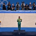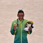 - Gold medallist Brazil’s Rebeca Andrade poses on the podium of the vault event of the artistic gymnastics women’s vault final during the Tokyo 2020 Olympic Games at the Ariake Gymnastics Centre in Tokyo on August 1, 2021. (Photo by Jeff PACHOUD / AFP)