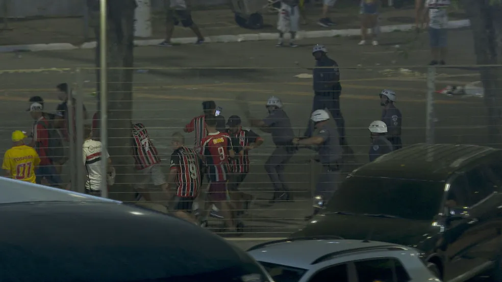Imagens mostradas na transmissão do SporTV reveleram policiais militares dando golpes de cacetete em um grupo de torcedores do São Paulo.