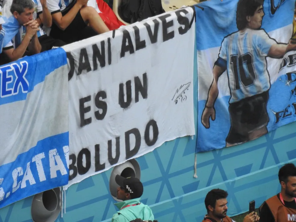O curioso é que a faixa que ofende Daniel Alves está completamente sem contexto no setor, ao lado de homenagens a Messi e Maradona e faixas com nomes de cidades e povoados do país.