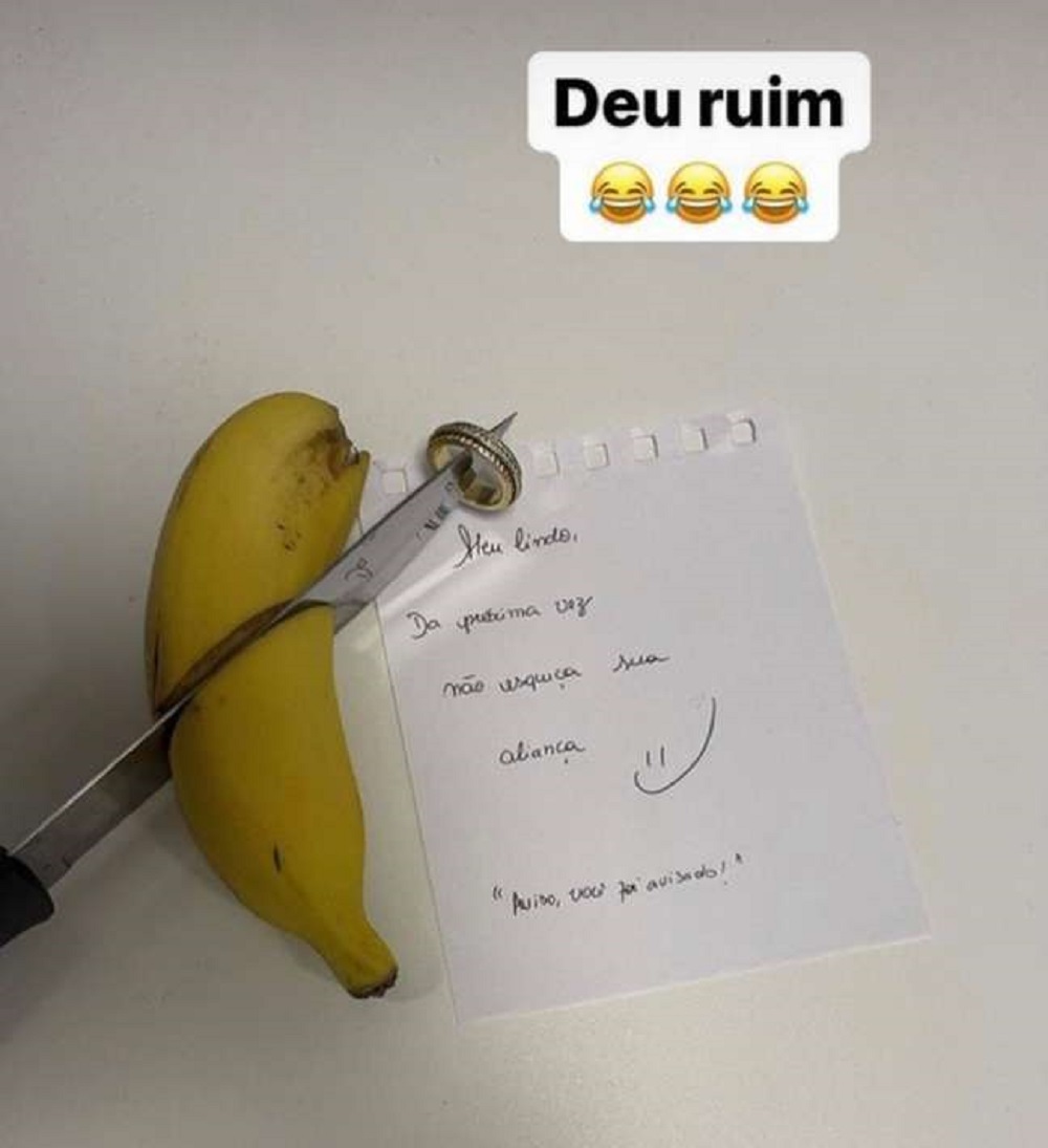 Nas redes sociais, o jogador compartilhou o recado deixado por Caroline. A esposa de Vina deixou um bilhete ao lado de uma faca cravada em uma banana com a aliança esquecida
