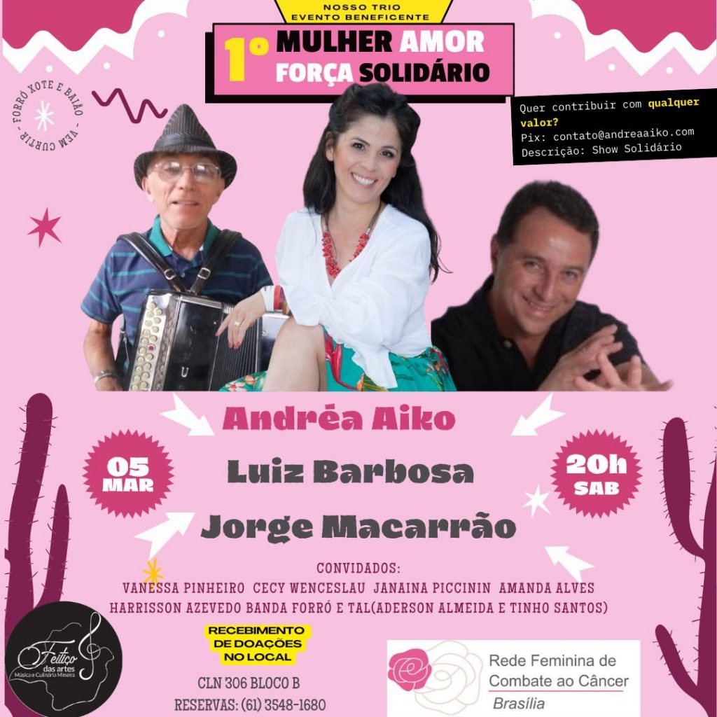 Organizado pela cantora e compositora que se destacou na pandemia pelo CD autoral Quero de Novo e por levar arte, amor e esperança para dentro das residências de todo o Brasil, Andréa Aiko chega com suas canções autorais do EP e arranjos de samba, xote, baião para, mais uma vez, dar voz para as mulheres. Ela contará ainda com a presença de toda essa equipe de músicos de Brasília que resolveram fazer esse show beneficente que também virou uma festa de pós-carnaval com cachê revertido para Instituições de mulheres com câncer.