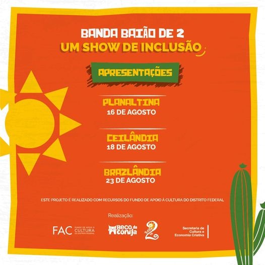 Nos dias 16, 18 e 23 de agosto, as apresentações acontecem, pela manhã, às 10h, e durante a tarde, às 14h, na Escola Mestre Darmas (Planaltina), no CEM 14 (Ceilândia) e na Escola Parque da Natureza (Brazlândia), respectivamente. Seguindo o mote Banda Baião de 2, Um Show de Inclusão, o grupo apresenta um repertório que passeia por músicas de Gilberto Gil, Alceu Valença, Luiz Gonzaga, Marisa Monte, Zé Ramalho e outros artistas consagrados na música brasileira.