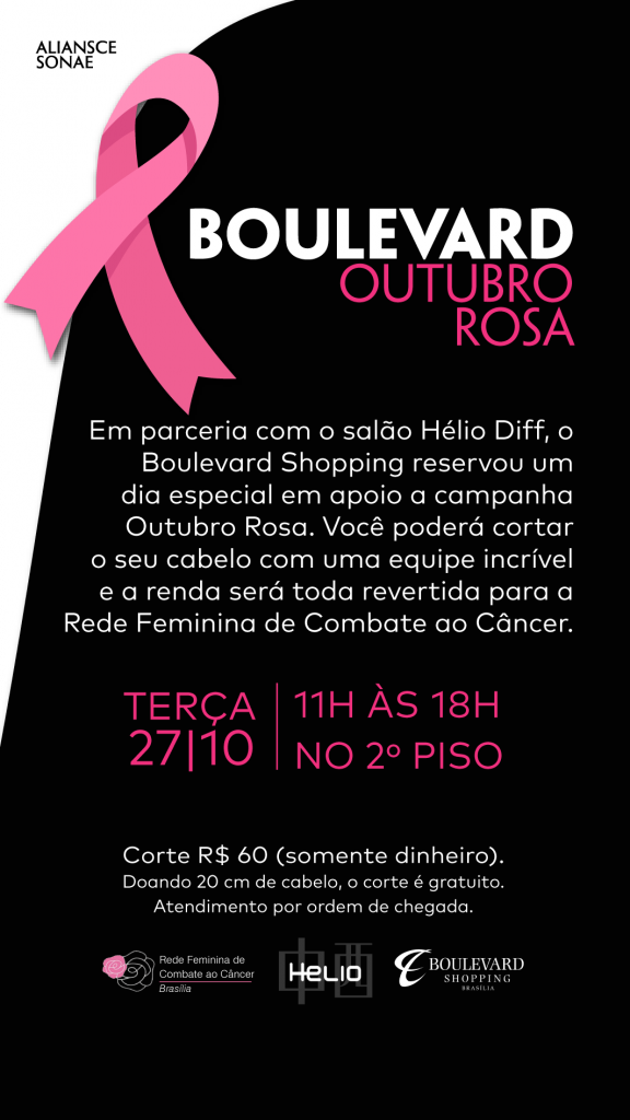 Criado com o objetivo de divulgar a importância do diagnóstico precoce e do autoexame para o câncer de mama, o Outubro Rosa se desdobra hoje em uma série de ações e campanhas para conscientizar a população sobre o tema. Pensando nisso, o Boulevard Shopping Brasília, administrado pela Aliansce Sonae Shopping Centers, criou o dia do Corte solidário, que acontece na próxima terça-feira (27), no 2° piso do mall.