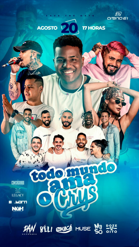 Sábado (20) é dia de overdose de pagode no ‘Todo Mundo Ama o Crys’. Além do Crys, atração principal, tem participação dos grupos Doze Por Oito e Mesô e dos artistas Béli e Dan Negreiro. Os DJs Kacá e Muse também se apresentam. A festa rola no Arena 61, a partir das 16h. Os ingressos custam R$ 30.