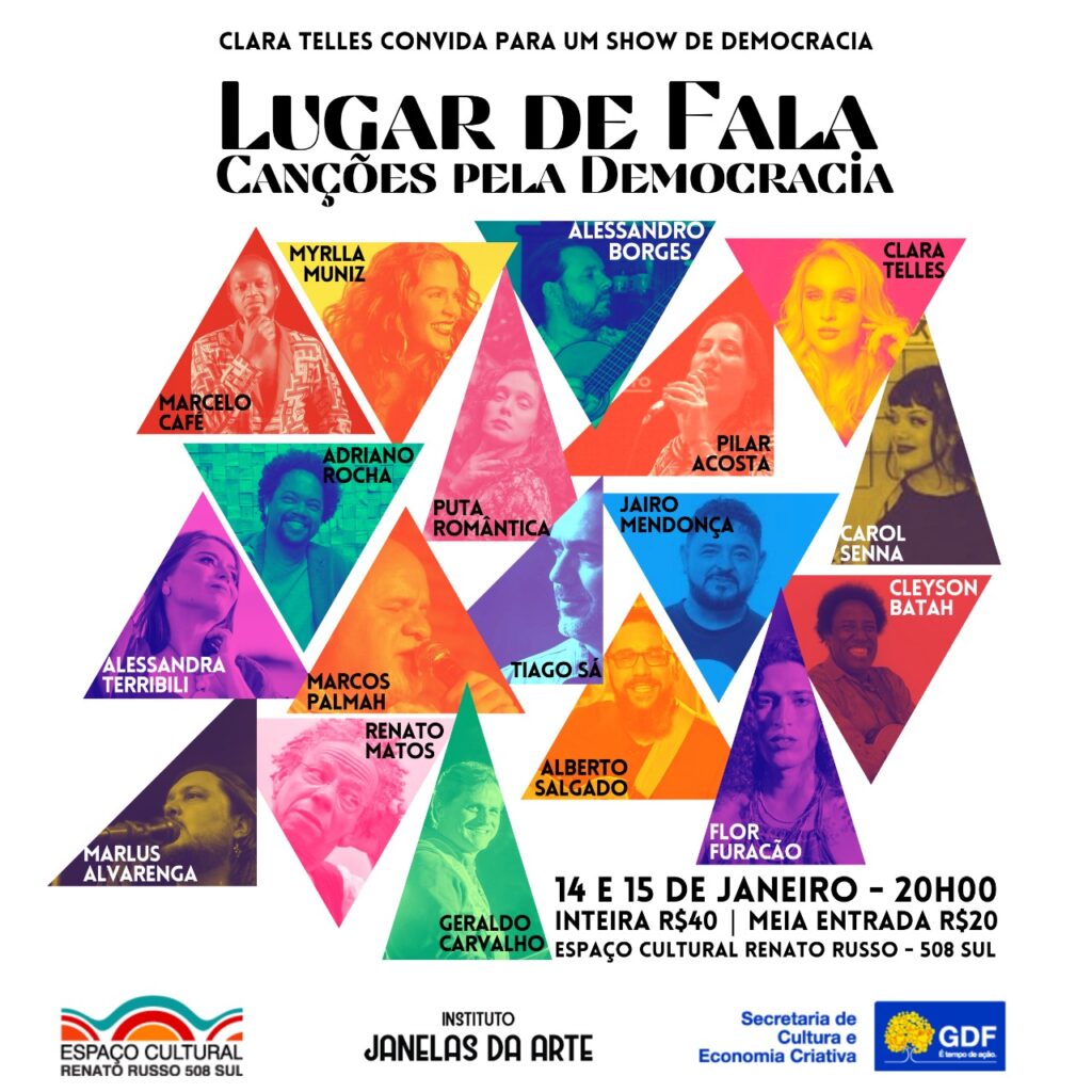 Cantores e instrumentistas de Brasília apresentam, no próximo sábado e domingo (14 e 15 /1), o show “Lugar de fala: canções pela democracia”. O evento será realizado no Espaço Cultural Renato Russo (508 Sul), a partir das 20 horas, na Sala Marco Antônio Guimarães.