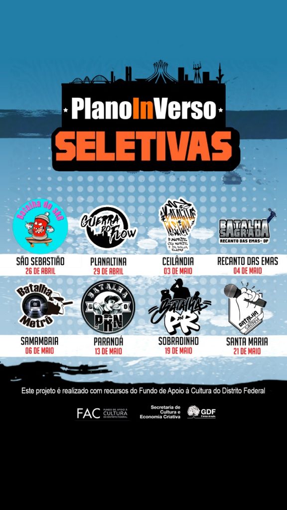 Foi pensando nisso, que os artistas e produtores brasilienses Tiago Santos TG e Jefferson Leão resolveram criar o Festival Plano (in)Verso. Um evento democrático com o foco direcionado para a turma da Arte Urbana que, agora, com o patrocínio da Secretaria de Cultura e Economia Criativa do Distrito Federal por meio do Fundo de Apoio à Cultura (FAC-DF), abrirá a oportunidade para a turma do Hip Hop das regiões administrativas do DF voltarem aos palcos e concorrem a prêmios.