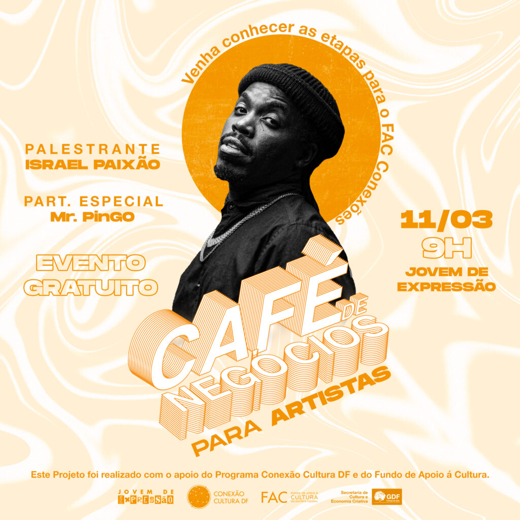 Networking, arte e troca de experiências não vão faltar no primeiro Café de Negócios para Artistas no Jovem de Expressão, em Ceilândia (DF). Liderada pelo rapper e compositor Israel Paixão, com participação especial do produtor cultural Mr.PinGO, a roda de conversa será realizada neste sábado (11/3), a partir das 9h.