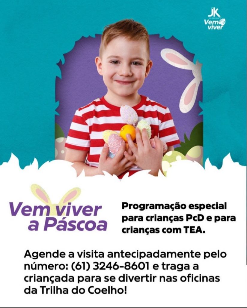 E pensando em ofertar diversão a todos, o JK Shopping reservou de segunda a sexta-feira horários especiais para o público infantil com deficiência e transtorno do espectro autista (TEA), participarem das oficinas com a temática Páscoa de forma gratuita. Para agendamento, é necessário entrar em contato pelo número (61) 3246-8601.