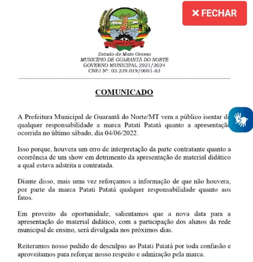 Nesta terça-feira (7), a prefeitura informou, em nota, que houve um erro de interpretação e admitiram que não havia sido combinado um show com os artistas, mas somente uma apresentação do material didático para ser divulgado em uma escola da cidade.