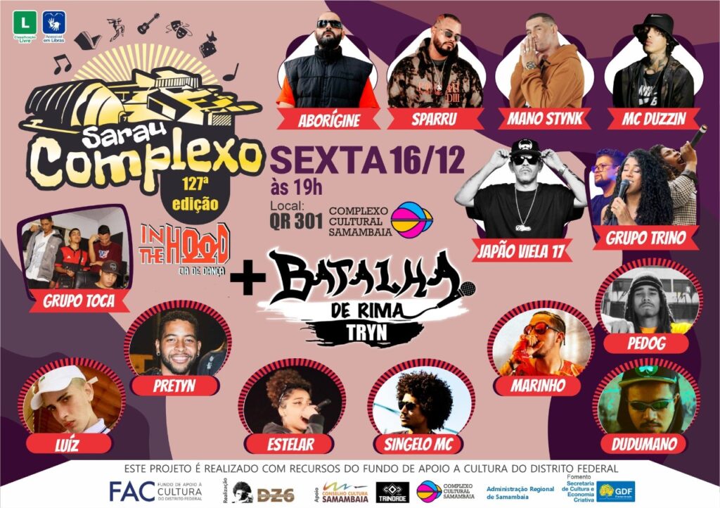 Uma batalha de rima premiada também acontecerá com os participantes Vencedor da Santinha, Vencedor da Estrutural, Estelar, Marinho, Hate RCT e Singelo. O Sarau Complexo ocorre mensalmente com fomento da Secretaria de Cultura e Economia Criativa do DF, e do Fundo de Apoio à Cultura (FAC-DF).