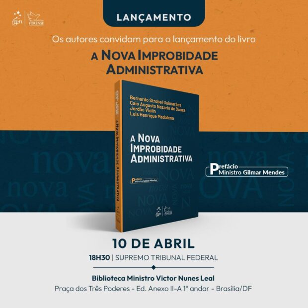 No dia 10 de abril, acontecerá o lançamento do livro “A nova improbidade administrativa”. O evento será na sede do Supremo Tribunal Federal (STF), na biblioteca Victor Nunes Leal (primeiro andar, Anexo II-A), a partir das 18:30h.