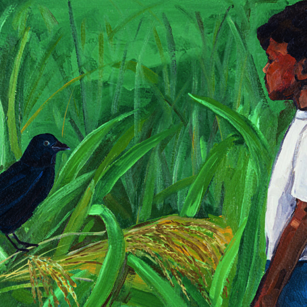 Para ele, o chupim não é um inimigo, mas um aliado que, ao deixar cair outros grãos de arroz enquanto alça voo, pode ajudar a semear novos campos para que sua família viva neles.