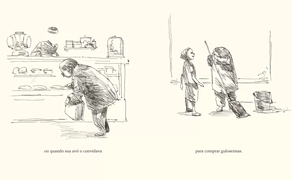 Nos desenhos, eles surgem com corpos transparentes. A gente só sabe que estão ali por causa das roupas. Só elas podem ser vistas e mostram que essas pessoas estão lá. As páginas, então, surgem recheadas de casacos sem cabeças, blusas sem braços, bonés flutuantes, bermudas sem pernas.