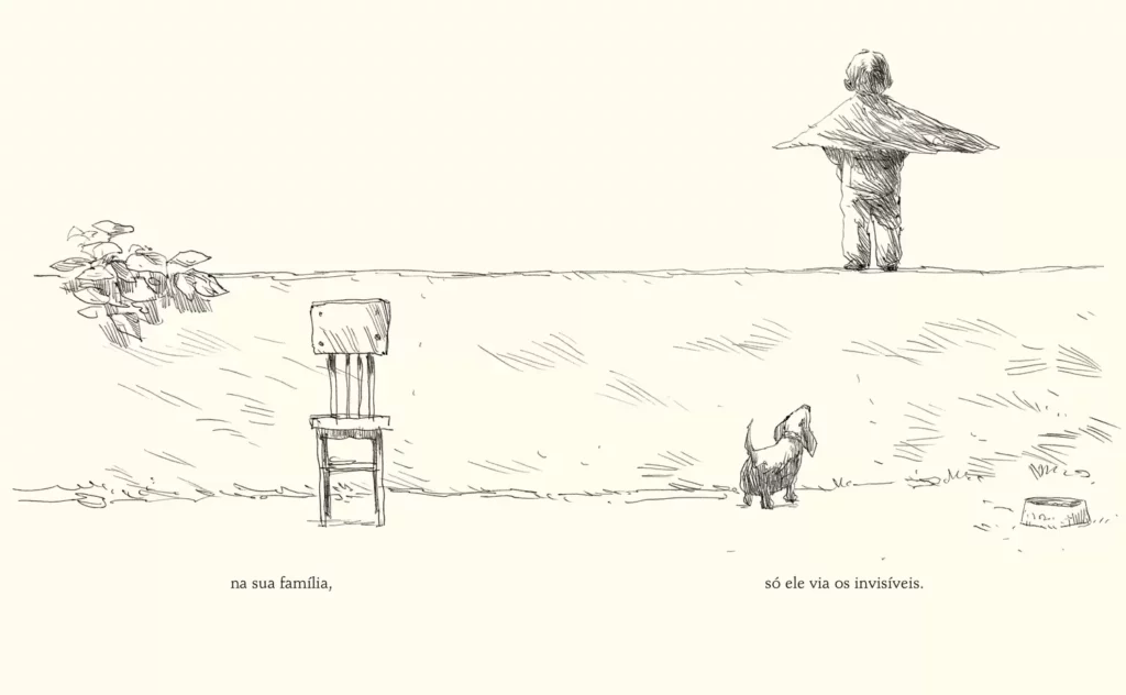 Na história, um menino tem um superpoder e só ele consegue enxergar os invisíveis. Quem são esses seres? Monstros transparentes? Criaturas fantásticas? Magos, bruxas, bichos mitológicos? É aqui que mora uma das espertezas do livro -a gente não sabe, o texto não diz.