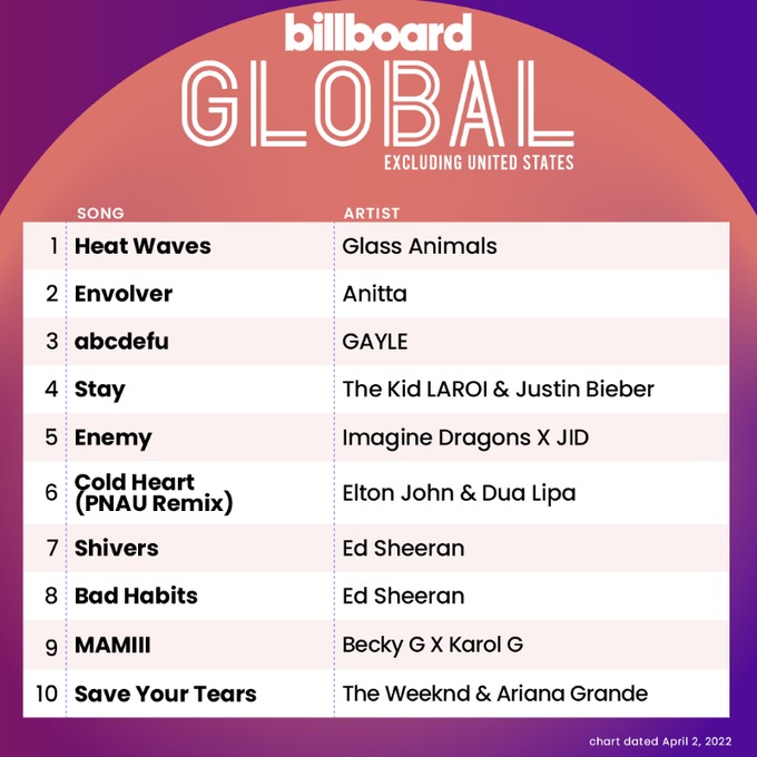 Na última semana, a música ocupou o 19º lugar no ranking Global, que inclui os Estados Unidos e o 12,º no que exclui.