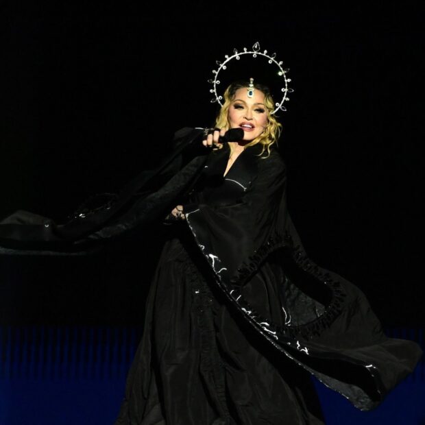 Na passagem, a cantora cobriu o corpo de um dançarino caído no chão com um pano preto. Emendou, então, um trecho de “Storm” com “Live to Tell”.