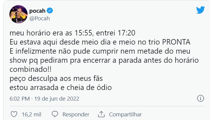 A cantora Pocah, 27, saiu do Rio de Janeiro rumo a São Paulo para se apresentar na Parada LGBTQIA+ no domingo (19). E isso aconteceu. Porém, ela ficou na bronca por, segundo ela, só ter podido cantar três músicas até que a polícia mandou acabar a apresentação.