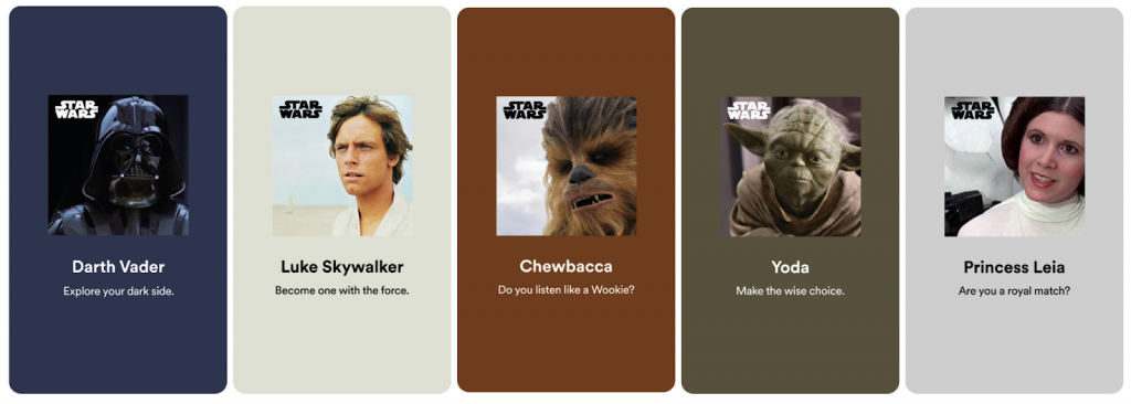 Atenção, Mestres Jedi e jovens Padawans! Para celebrar o dia de hoje, também conhecido por Star Wars Day (Dia de Star Wars, em português), o Spotify leva o recurso Match para uma galáxia muito, muito distante, dando aos usuários a chance de dar match com alguns de seus personagens favoritos de Star Wars: Até o dia 08 de maio, é possível combinar o seu gosto musical com Yoda, Chewbacca, Luke Skywalker, Darth Vader, ou Princess Leia para criar uma playlist compartilhada repleta das suas músicas favoritas.