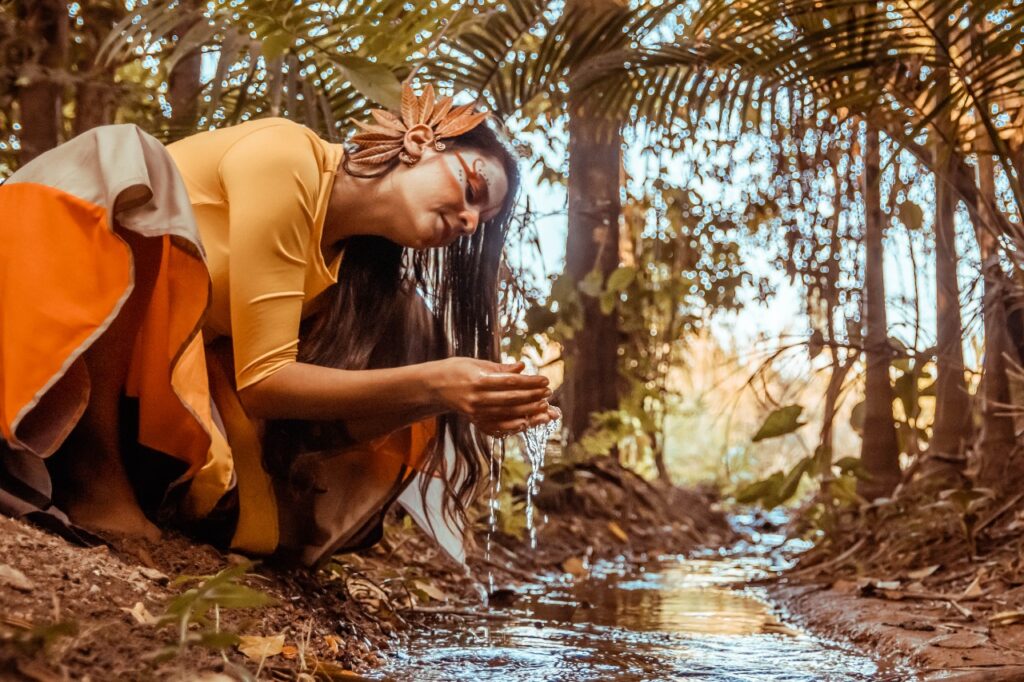 Goyá vem de longe… E caminhando sobre o barro branco e a terra vermelha chega para nos contar histórias que ouviu do Cerrado e de seus povos originários. Uma cabocla nascida nas beiras do Córrego Taguatinga, neta e filha de mulheres campesinas, descendente de gente que planta alimento, floresta e vida no solo cerratense do planalto central. Goyá conversa com a mata e com os pássaros, dança com as águas e semeia histórias para manter a floresta de pé.
